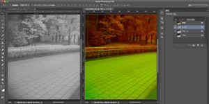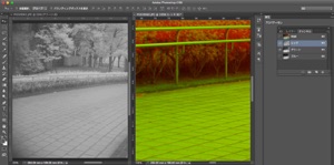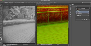 3)これらを合成し、チャンネルミキサーによって、出力Rチャンネルは赤外線写真のGチャンネルの画像、出力Gチャンネルは可視光写真のRチャンネルの画像、出力Bチャンネルは可視光写真のGチャンネルの画像を出力するようにします。