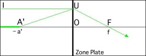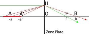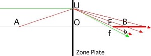First, we assume that a light from a point source (A) at a finite distance proceeds through a point (U) on the n-th zone to a position (B) on an image plane. Then the following equation holds.