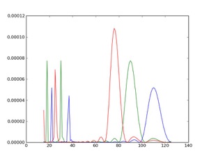 Light intensity distribution for wavelengths of 450 (blue), 550 (green), 650 (red) nm by a zone plate with wavelength of 550 nm, number of zones of 15, and focal length of 90 mm. Thin peaks in the left side are sub-focal points with the focal length of f/3 and f/5.